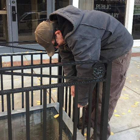 Ben Hoksbergen lifting a brick from the old sidewalk.
